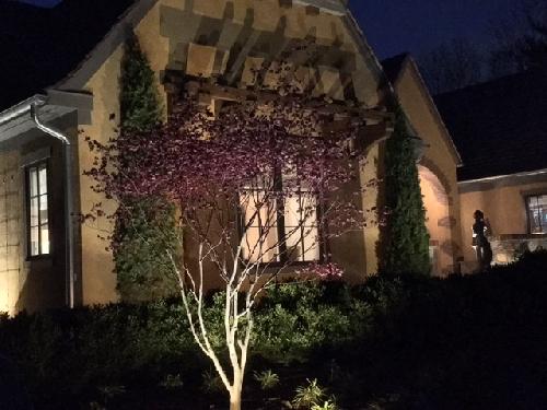 Landscape Lighting Villanova P.A. using varying color LED we were able to soften the architecture and accentuate the reclaimed Timbers